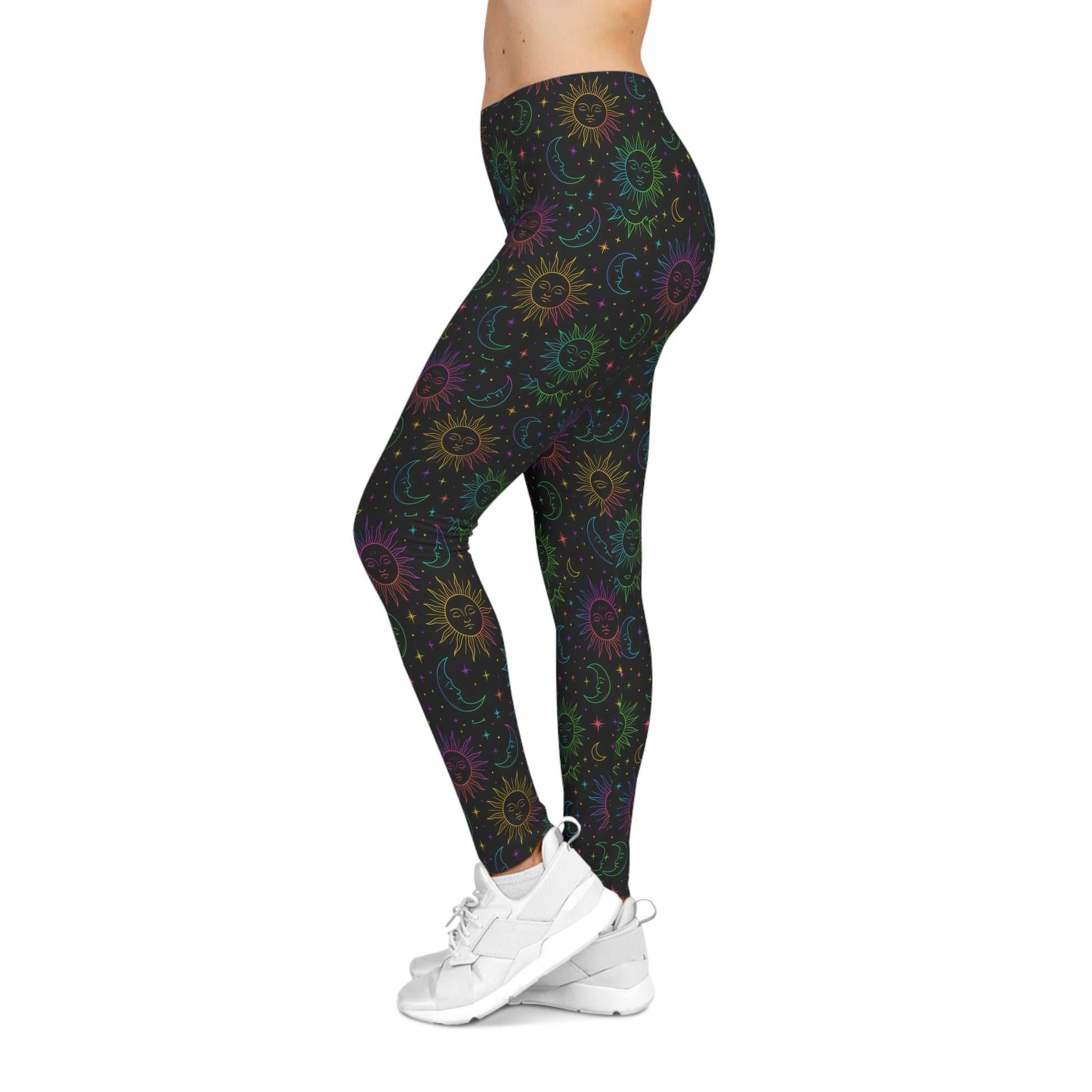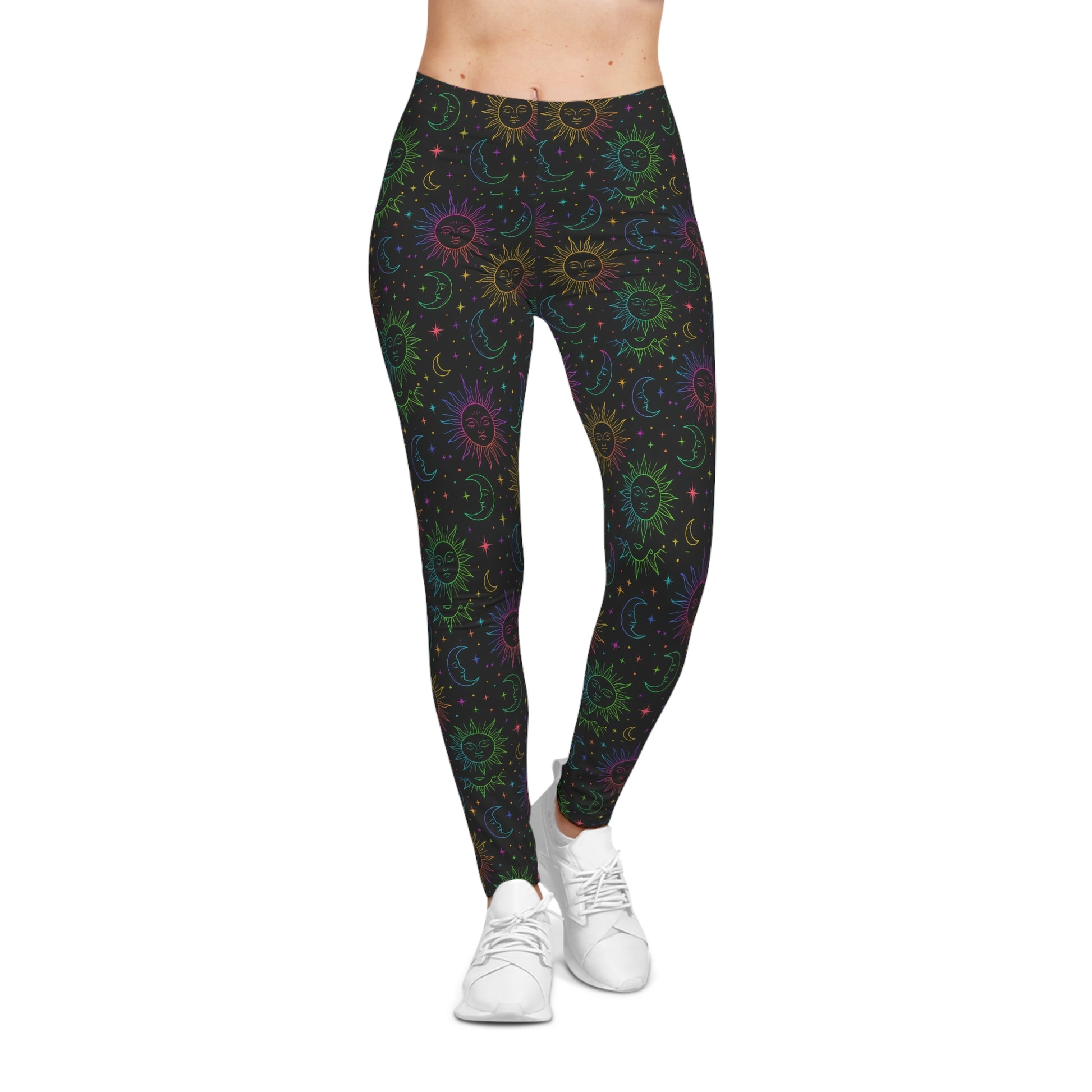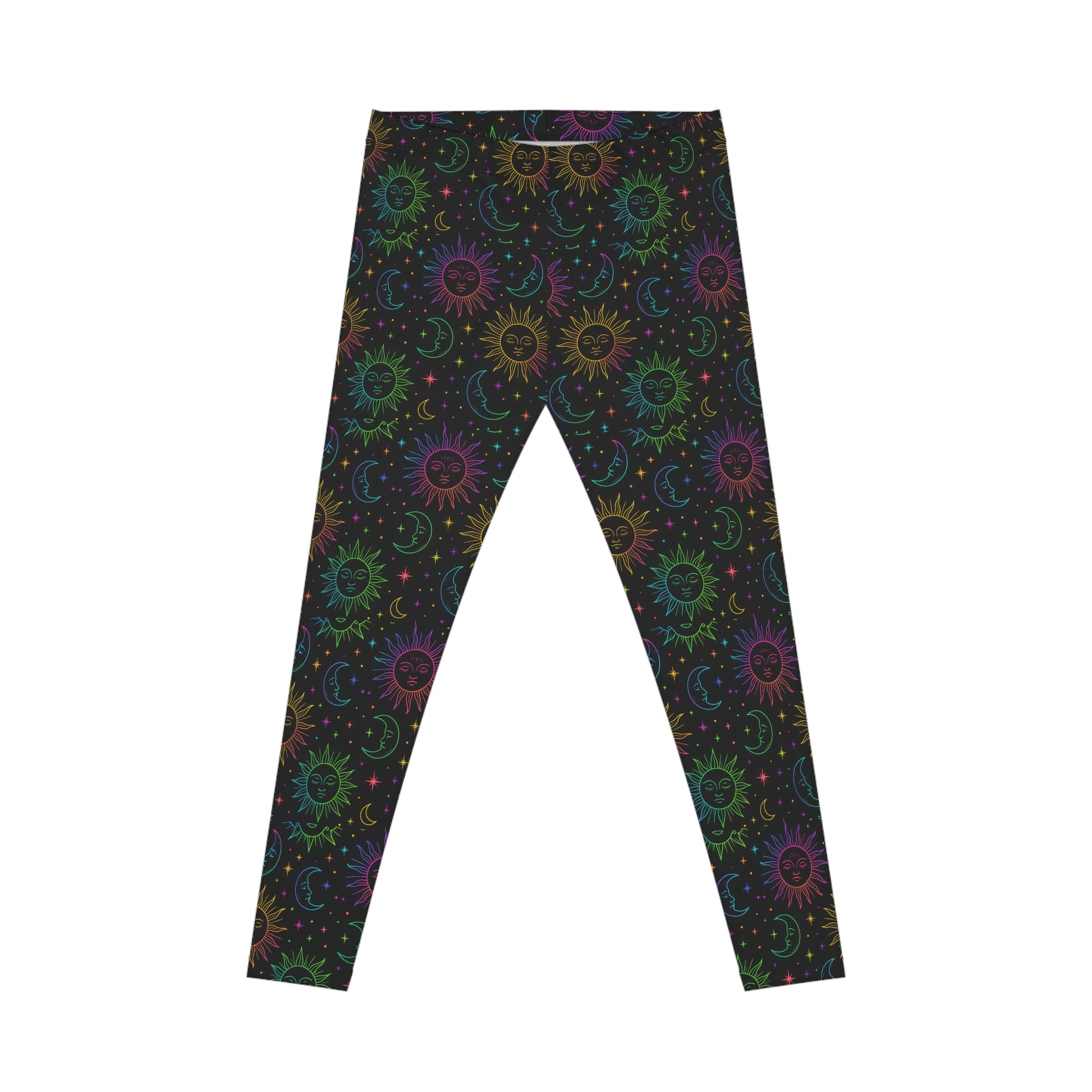 Celestial Sun & Moon Pattern Leggings — Rainbow Cosmic Print