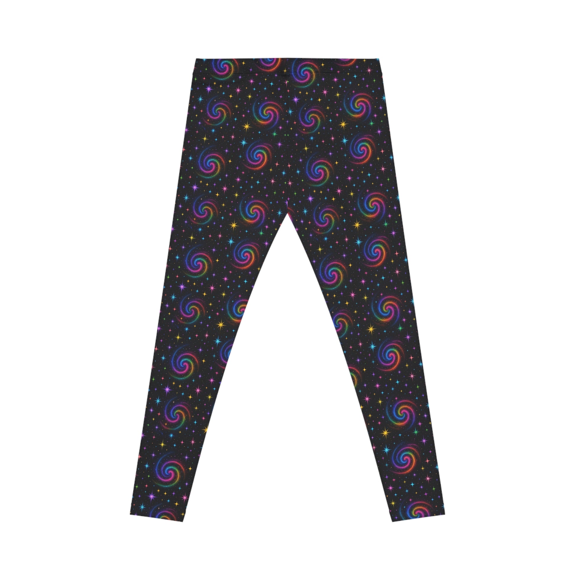 Slide into these silky, rainbow-swirled leggings and carry a little midnight carnival with you. The rich, crisp print bursts from a deep black background — tiny confetti dots and colorful spiral motifs that catch the eye without shouting. They move with you: the spandex blend stretches smoothly, the thin mid-rise waistband sits comfortably for everyday wear, and the smooth finish feels soft against skin. Wear them to brighten a quiet coffee run, a late-night walk, or a vinyl-listening session at home — they bring playful energy and effortless comfort to slow mornings and spontaneous nights alike.